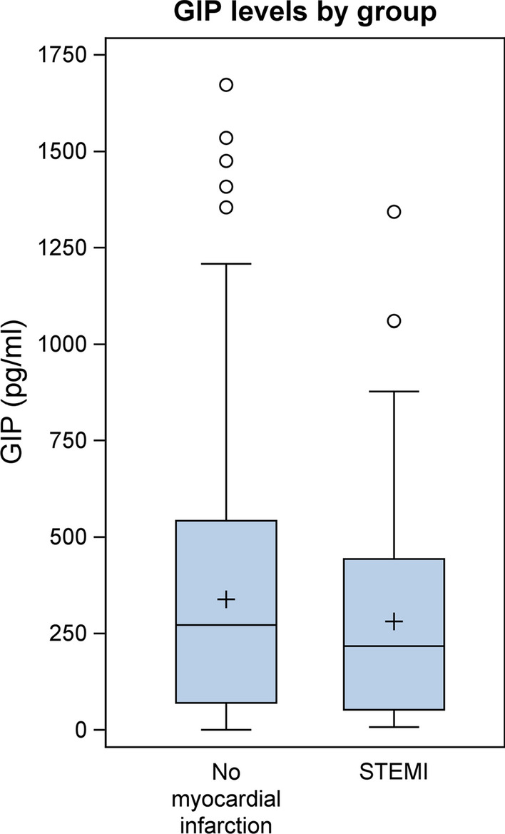 Background: The gut incretin hormones GLP-1 (glucagon-like peptide-1) and GIP (glucose-dependent insulinotropic peptide) are secreted by enteroendocrine cells following food intake leading to insulin secretion and glucose lowering. Beyond its metabolic function GIP has been found to exhibit direct cardio- and atheroprotective effects in mice and to be associated with cardiovascular prognosis in patients with myocardial infarction. The aim of this study was to characterize endogenous GIP levels in patients with acute myocardial infarction.