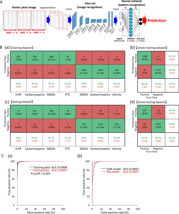 In vitro microelectrode array (MEA) assessment using human induced pluripotent stem cell (iPSC)-derived neurons holds promise as a method of seizure and toxicity evaluation. However, there are still issues surrounding the analysis methods used to predict seizure and toxicity liability as well as drug mechanisms of action. In the present study, we developed an artificial intelligence (AI) capable of predicting the seizure liability of drugs and identifying drugs using deep learning based on raster plots of neural network activity. The seizure liability prediction AI had a prediction accuracy of 98.4% for the drugs used to train it, classifying them correctly based on their responses as either seizure-causing compounds or seizure-free compounds. The AI also made concentration-dependent judgments of the seizure liability of drugs that it was not trained on. In addition, the drug identification AI implemented using the leave-one-sample-out scheme could distinguish among 13 seizure-causing compounds as well as seizure-free compound responses, with a mean accuracy of 99.9 ± 0.1% for all drugs. These AI prediction models are able to identify seizure liability concentration-dependence, rank the level of seizure liability based on the seizure liability probability, and identify the mechanism of the action of compounds. This holds promise for the future of in vitro MEA assessment as a powerful, high-accuracy new seizure liability prediction method.