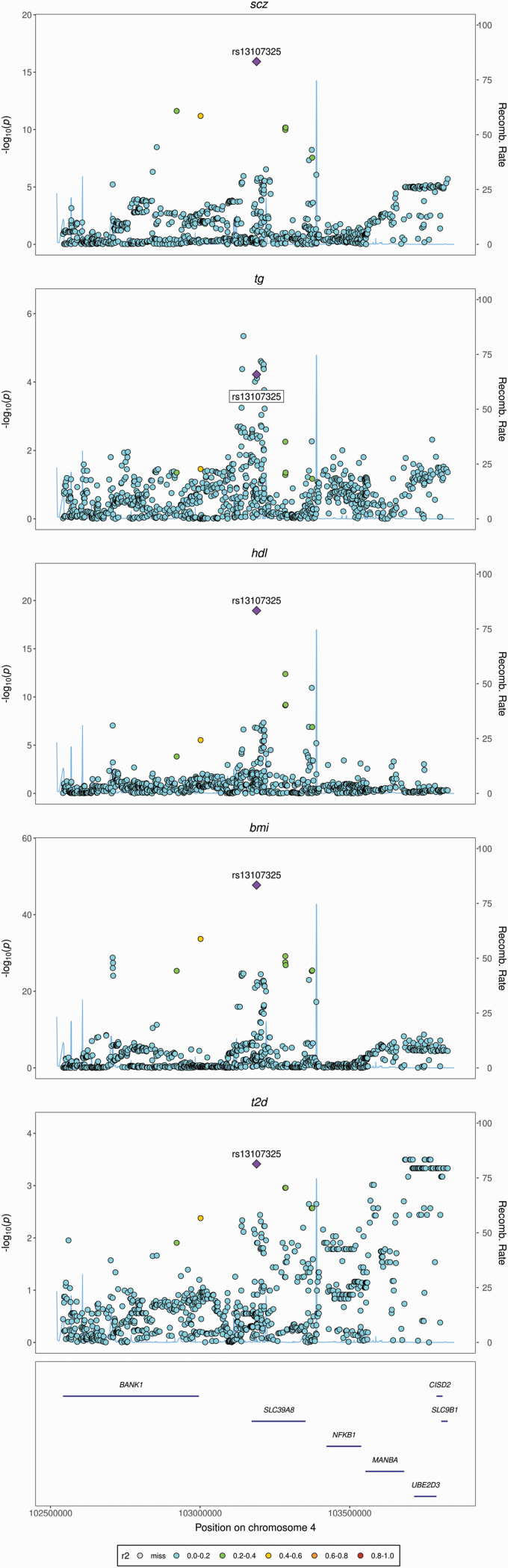 Results: We found evidence for weak genome-wide negative correlation of schizophrenia with T2D (rg = -0.07; 95% C.I., -0.03,0.12; P = .002) and BMI (rg = -0.09; 95% C.I., -0.06, -0.12; P = 1.83 × 10-5). We found a trend of evidence for positive genetic correlation between schizophrenia and cardiometabolic traits confined to lower-frequency variants. This was underpinned by 85 regions of locus-level correlation with evidence of opposing mechanisms. Ten loci showed strong evidence of colocalization. Four of those (rs6265 (BDNF); rs8192675 (SLC2A2); rs3800229 (FOXO3); rs17514846 (FURIN)) are implicated in brain-derived neurotrophic factor (BDNF)-related pathways.