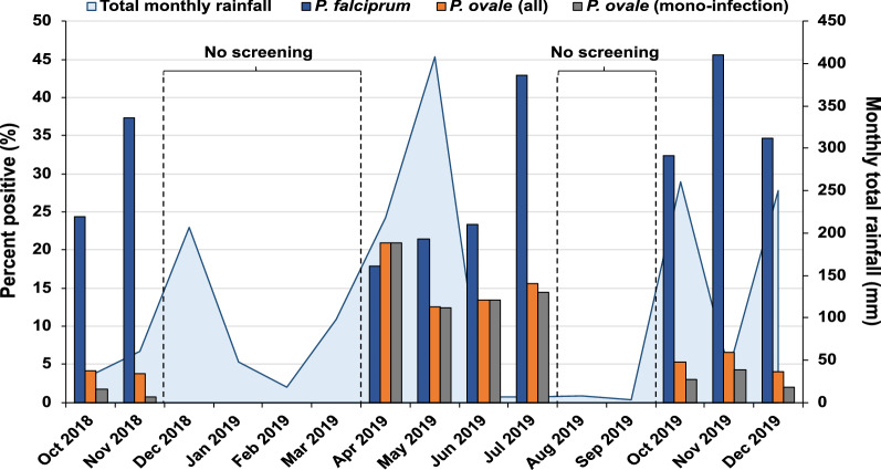 Results: Molecular surveillance of asymptomatic individuals revealed a P. ovale prevalence of 11% (300/2718), compared to 29% (780/2718) for P. falciparum. Prevalence for P. ovale was highest at the beginning of the long rainy season (15.5%, 128/826) in contrast to P. falciparum, which peaked later in both the long and short rainy seasons. Considering that these early-season P. ovale infections were low-density mono-infections (127/128), we speculate many were due to hypnozoite-induced relapse. Six of eight P. ovale-infected asymptomatic individuals who underwent DFAs successfully transmitted P. ovale parasites to A. gambiae.