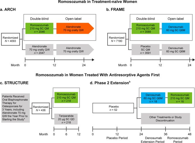 Introduction: Teriparatide followed by an antiresorptive increases bone mineral density (BMD) more than using an antiresorptive first. To evaluate whether treatment sequence affects romosozumab response, we reviewed randomized clinical trials where romosozumab was administered before (ARCH, FRAME) or following (STRUCTURE, Phase 2 extension) an antiresorptive (alendronate or denosumab, respectively).