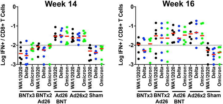 Results: Omicron neutralizing antibodies were observed following the boost immunization and were higher in animals that received BNT162b2, whereas Omicron CD8+ T cell responses were higher in animals that received Ad26.COV2.S. Following Omicron challenge, sham controls showed more prolonged virus in nasal swabs than in bronchoalveolar lavage. Vaccinated macaques demonstrated rapid control of virus in bronchoalveolar lavage, and most vaccinated animals also controlled virus in nasal swabs, showing that current vaccines provide substantial protection against Omicron in this model. However, vaccinated animals that had moderate levels of Omicron neutralizing antibodies but negligible Omicron CD8+ T cell responses failed to control virus in the upper respiratory tract. Virologic control correlated with both antibody and T cell responses.