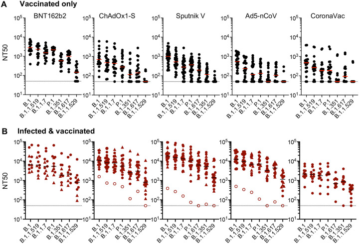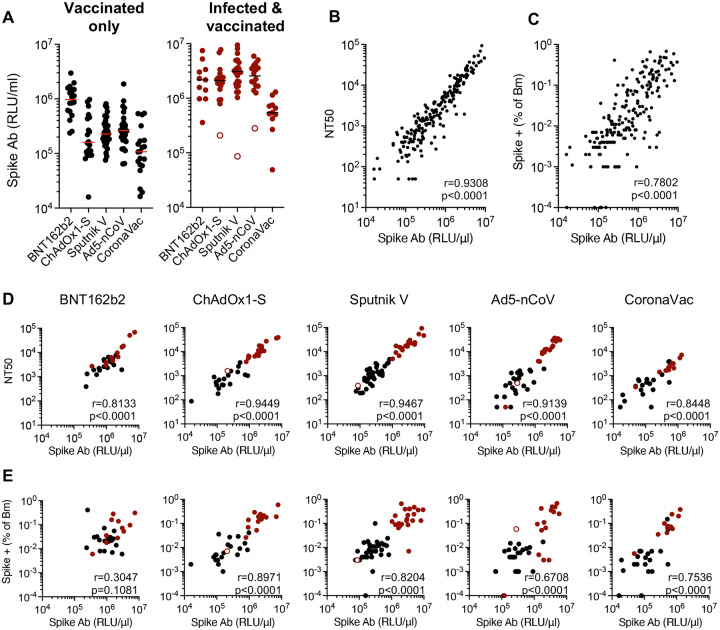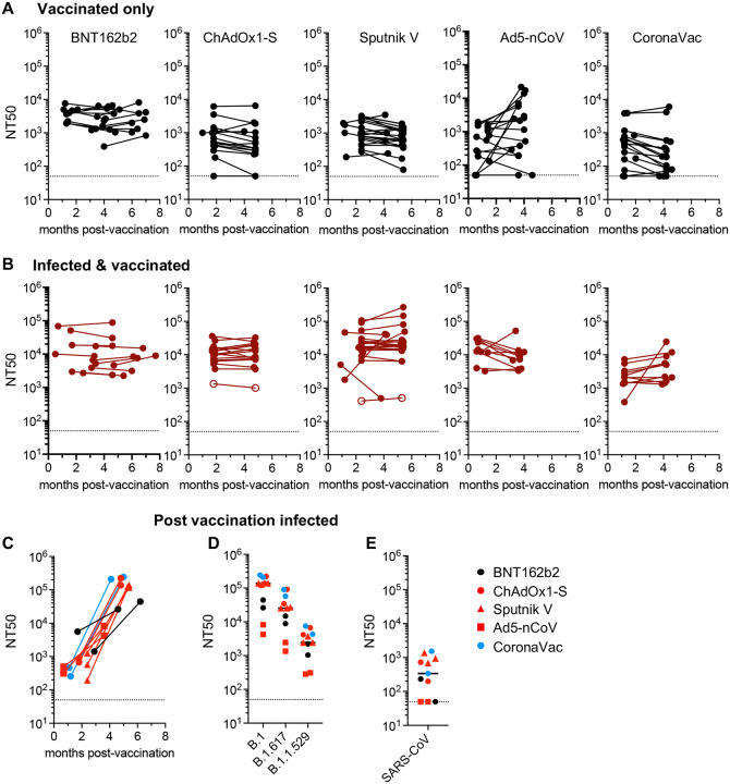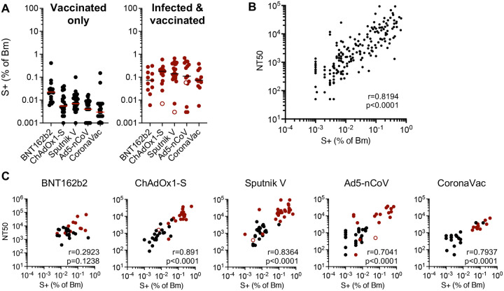Global population immunity to SARS-CoV-2 is accumulating through heterogenous combinations of infection and vaccination. Vaccine distribution in low- and middle-income countries has been variable and reliant on diverse vaccine platforms. We studied B-cell immunity in Mexico, a middle-income country where five different vaccines have been deployed to populations with high SARS-CoV-2 incidence. Levels of antibodies that bound a stabilized prefusion spike trimer, neutralizing antibody titers and memory B-cell expansion correlated with each other across vaccine platforms. Nevertheless, the vaccines elicited variable levels of B-cell immunity, and the majority of recipients had undetectable neutralizing activity against the recently emergent omicron variant. SARS-CoV-2 infection, experienced prior to or after vaccination potentiated B-cell immune responses and enabled the generation of neutralizing activity against omicron and SARS-CoV for all vaccines in nearly all individuals. These findings suggest that broad population immunity to SARS-CoV-2 will eventually be achieved, but by heterogenous paths.