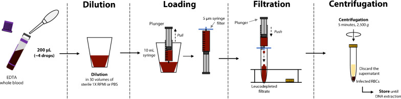 Conclusions: The novel 5WBF leucodepletion method is simple to implement and based on commercially available, standardized 5 µm filters which cost from 1.0 to 1.7€ per unit depending on suppliers. 5WBF permits extensive genome-wide analysis of P. falciparum ring-stage isolates from minute amounts of whole blood even with parasitaemias as low as 0.02%.