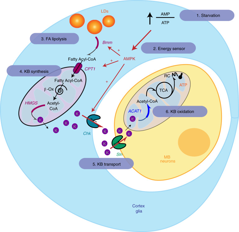 During starvation, mammalian brains can adapt their metabolism, switching from glucose to alternative peripheral fuel sources. In the Drosophila starved brain, memory formation is subject to adaptative plasticity, but whether this adaptive plasticity relies on metabolic adaptation remains unclear. Here we show that during starvation, neurons of the fly olfactory memory centre import and use ketone bodies (KBs) as an energy substrate to sustain aversive memory formation. We identify local providers within the brain, the cortex glia, that use their own lipid store to synthesize KBs before exporting them to neurons via monocarboxylate transporters. Finally, we show that the master energy sensor AMP-activated protein kinase regulates both lipid mobilization and KB export in cortex glia. Our data provide a general schema of the metabolic interactions within the brain to support memory when glucose is scarce.