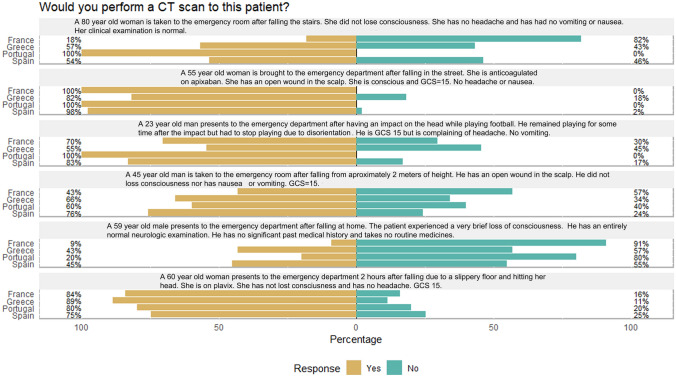 Methods: An electronic survey including structural and general management of mTBI patients and six clinical vignettes was conducted. In-charge physicians from France, Spain, Greece and Portugal were contacted by telephone and email. Differences among countries were searched using an unconditional approach test on contingency tables.