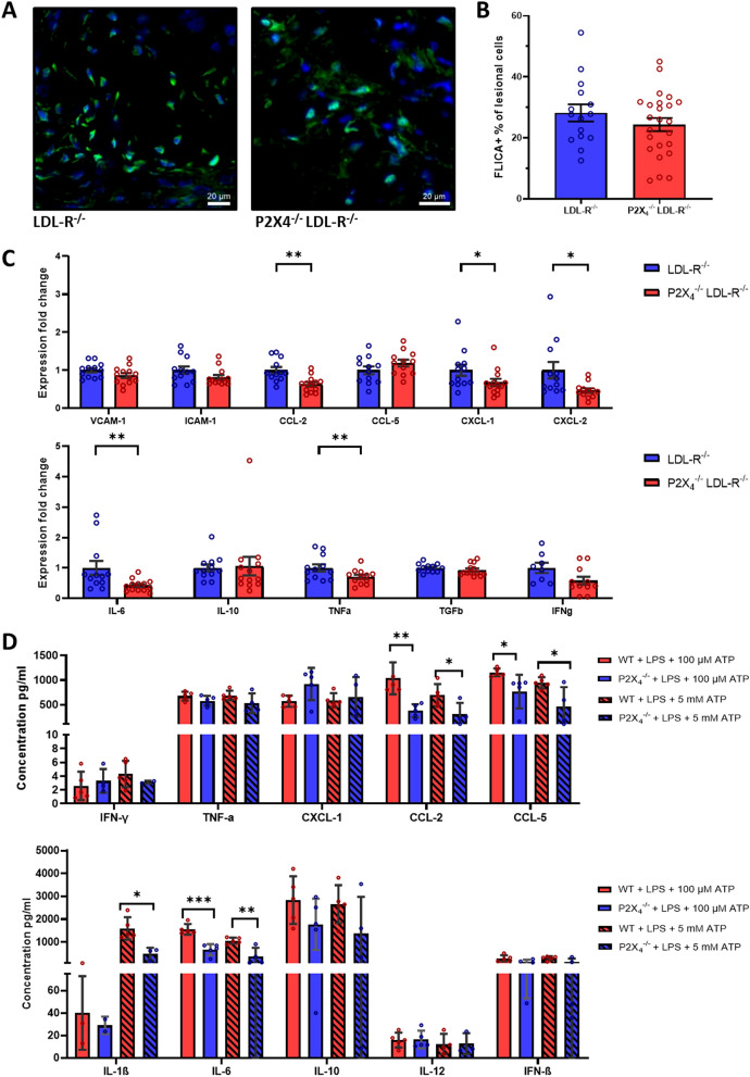 Extracellular adenosine-5'-triphosphate (ATP) acts as an import signaling molecule mediating inflammation via purinergic P2 receptors. ATP binds to the purinergic receptor P2X4 and promotes inflammation via increased expression of pro-inflammatory cytokines. Because of the central role of inflammation, we assumed a functional contribution of the ATP-P2X4-axis in atherosclerosis. Expression of P2X4 was increased in atherosclerotic aortic arches from low-density lipoprotein receptor-deficient mice being fed a high cholesterol diet as assessed by real-time polymerase chain reaction and immunohistochemistry. To investigate the functional role of P2X4 in atherosclerosis, P2X4-deficient mice were crossed with low-density lipoprotein receptor-deficient mice and fed high cholesterol diet. After 16 weeks, P2X4-deficient mice developed smaller atherosclerotic lesions compared to P2X4-competent mice. Furthermore, intravital microscopy showed reduced ATP-induced leukocyte rolling at the vessel wall in P2X4-deficient mice. Mechanistically, we found a reduced RNA expression of CC chemokine ligand 2 (CCL-2), C-X-C motif chemokine-1 (CXCL-1), C-X-C motif chemokine-2 (CXCL-2), Interleukin-6 (IL-6) and tumor necrosis factor α (TNFα) as well as a decreased nucleotide-binding oligomerization domain-like receptor protein 3 (NLRP3)-inflammasome priming in atherosclerotic plaques from P2X4-deficient mice. Moreover, bone marrow derived macrophages isolated from P2X4-deficient mice revealed a reduced ATP-mediated release of CCL-2, CC chemokine ligand 5 (CCL-5), Interleukin-1β (IL-1β) and IL-6. Additionally, P2X4-deficient mice shared a lower proportion of pro-inflammatory Ly6Chigh monocytes and a higher proportion of anti-inflammatory Ly6Clow monocytes, and expressend less endothelial VCAM-1. Finally, increased P2X4 expression in human atherosclerotic lesions from carotid endarterectomy was found, indicating the importance of potential implementations of this study's findings for human atherosclerosis. Collectively, P2X4 deficiency reduced experimental atherosclerosis, plaque inflammation and inflammasome priming, pointing to P2X4 as a potential therapeutic target in the fight against atherosclerosis.