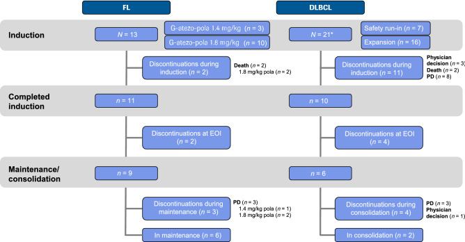 Results: 13 FL patients were treated and evaluable for safety; 2/23 DLBCL patients did not receive treatment and were not included in the safety population. Median observation time was 23.3 and 5.7 months in the FL and DLBCL cohorts, respectively. At EOI, CR rates in FL patients treated with G-atezo-pola at pola doses of 1.4 mg/kg (N = 3) and 1.8 mg/kg (N = 7) were 33% and 14%, respectively. In DLBCL patients receiving R-atezo-pola, the CR rate at EOI was 13%. In the FL cohort, 62% of patients experienced a grade 3-5 adverse event (AE; including two deaths) and 31% developed a serious AE (SAE). In DLBCL patients, R-atezo-pola was associated with a lower incidence of grade 3-5 AEs (24%; one death) and SAEs (10%). In both cohorts, the most common grade 3-5 AEs were hematologic toxicities.