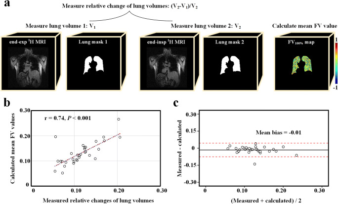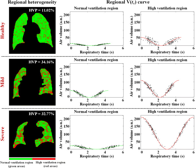 Results: There was no significant difference between COVID-19 and healthy groups regarding a static FD-V map (0.47 ± 0.12 vs 0.42 ± 0.08; p = .233). However, mPREFUL demonstrated lots of regional high ventilation areas (high ventilation percentage (HVP): 23.7% ± 10.6%) existed in survivors. This regional heterogeneity (i.e., HVP) in survivors was significantly higher than in healthy volunteers (p = .003). The survivors breathed deeper (flow-volume loop: 5375 ± 3978 vs 1688 ± 789; p = .005), and breathed more air in respiratory cycle (total amount: 62.6 ± 19.3 vs 37.3 ± 9.9; p < .001). Besides, mPREFUL showed both good Pearson's correlation (r = 0.74; p < .001) and Bland-Altman consistency (mean bias = -0.01) with FVGlobal.