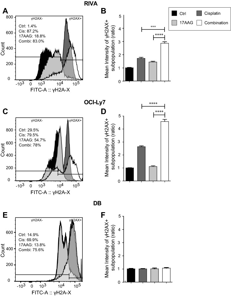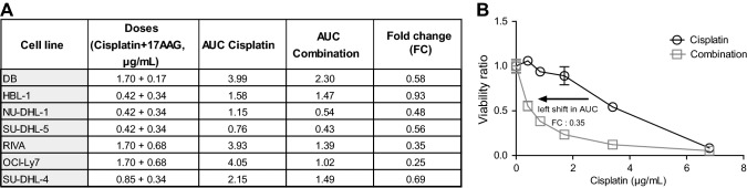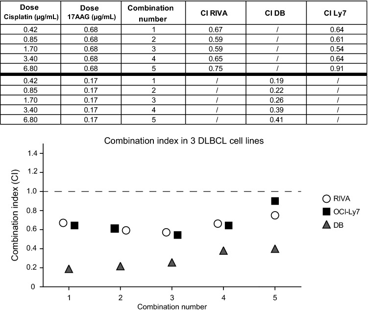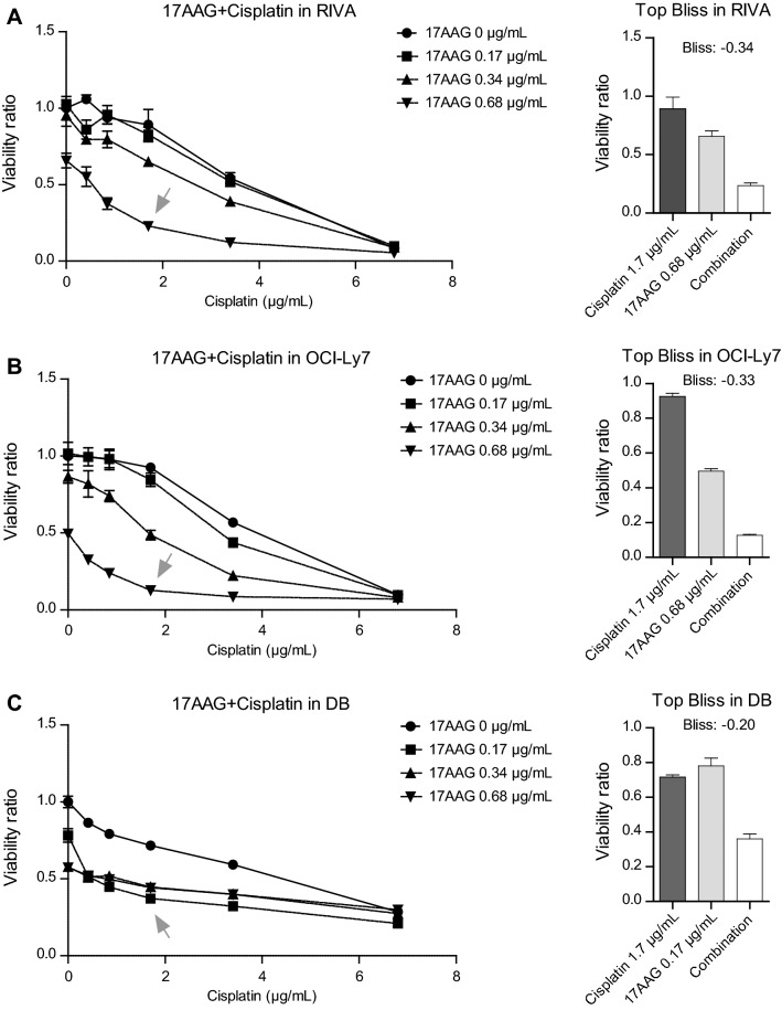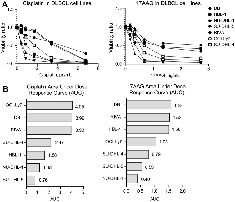 Methods: Cell viability was assessed for cisplatin and 17AAG as monotherapies and for 25 different combinations in 7 DLBCL cell lines, where the Bliss Independence Model and the Combination Index were applied to assess their interaction. Induction of apoptosis and DNA damage response were evaluated by measuring Annexin V and γH2AX levels after 48 h of exposure.