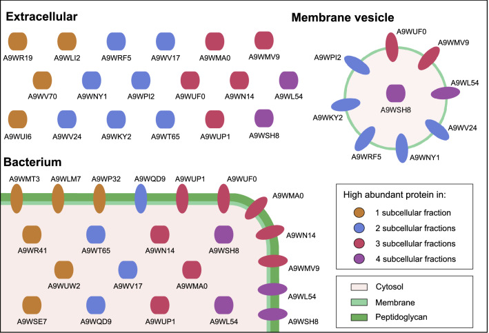 Bacterial kidney disease (BKD) is a chronic bacterial disease affecting both wild and farmed salmonids. The causative agent for BKD is the Gram-positive fish pathogen Renibacterium salmoninarum. As treatment and prevention of BKD have proven to be difficult, it is important to know and identify the key bacterial proteins that interact with the host. We used subcellular fractionation to report semi-quantitative data for the cytosolic, membrane, extracellular, and membrane vesicle (MV) proteome of R. salmoninarum. These data can aid as a backbone for more targeted experiments regarding the development of new drugs for the treatment of BKD. Further analysis was focused on the MV proteome, where both major immunosuppressive proteins P57/Msa and P22 and proteins involved in bacterial adhesion were found in high abundance. Interestingly, the P22 protein was relatively enriched only in the extracellular and MV fraction, implicating that MVs may play a role in host-pathogen interaction. Compared to the other subcellular fractions, the MVs were also relatively enriched in lipoproteins and all four cell wall hydrolases belonging to the New Lipoprotein C/Protein of 60 kDa (NlpC/P60) family were detected, suggesting an involvement in the formation of the MVs.