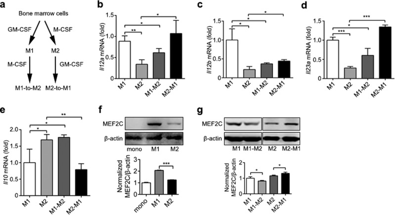 The polarization of macrophages to the M1 or M2 phenotype has a pivotal role in inflammation and host defense; however, the underlying molecular mechanism remains unclear. Here, we show that myocyte enhancer factor 2 C (MEF2C) is essential for regulating M1 macrophage polarization in response to infection and inflammation. Global gene expression analysis demonstrated that MEF2C deficiency in macrophages downregulated the expression of M1 phenotypic markers and upregulated the expression of M2 phenotypic markers. MEF2C significantly promoted the expression of interleukin-12 p35 subunit (Il12a) and interleukin-12 p40 subunit (Il12b). Myeloid-specific Mef2c-knockout mice showed reduced IL-12 production and impaired Th1 responses, which led to susceptibility to Listeria monocytogenes infection and protected against DSS-induced IBD in vivo. Mechanistically, we showed that MEF2C directly activated the transcription of Il12a and Il12b. These findings reveal a new function of MEF2C in macrophage polarization and Th1 responses and identify MEF2C as a potential target for therapeutic intervention in inflammatory and autoimmune diseases.