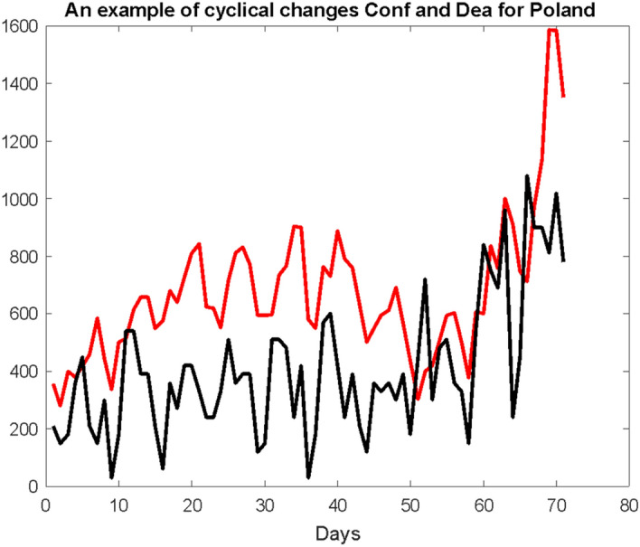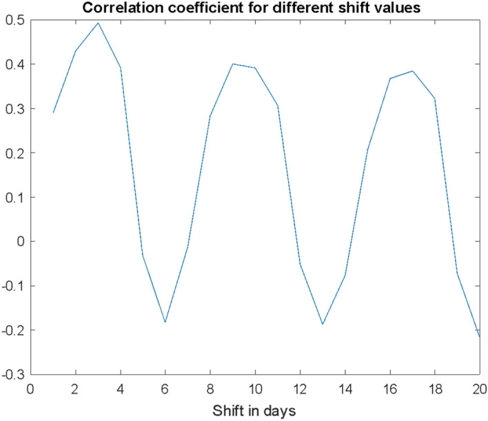 There are many discussions in the media about an interval (delay) from the time of the infections to deaths. Apart from the curiosity of the researchers, defining this time interval may, under certain circumstances, be of great organizational and economic importance. The study considers an attempt to determine this difference through the correlations of shifted time series and a specific bootstrapping that allows finding the distance between local maxima on the series under consideration. We consider data from Poland, the USA, India and Germany. The median of the difference's distribution is quite consistent for such diverse countries. The main conclusion of our research is that the searched interval has rather a multimodal form than unambiguously determined.