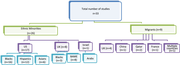 Results: 31 of the included studies were conducted in high-income countries, including in the US (n = 17 studies), UK (n = 10), Qatar (n = 2), Israel (n = 1) and France (n = 1). One study was in an upper middle-income country -China (n = 1) and another covered multiple countries (n = 1). 26 studies reported outcomes for ethnic minorities while 9 studies reported on migrants. Most of the studies were quantitative -cross sectional studies (n = 24) and ecological (n = 4). The remaining were qualitative (n = 4) and mixed methods (n = 1). There was consistent evidence of elevated levels of COVID-19 vaccine hesitancy among Black/Afro-Caribbean groups in the US and UK, while studies of Hispanic/Latino populations in the US and Asian populations in the UK provided mixed pictures, with levels higher, lower, or the same as their White counterparts. Asians in the US had the highest COVID-19 vaccine acceptance compared to other ethnic groups. There was higher vaccine acceptance among migrant groups in Qatar and China than in the general population. However, migrants to the UK experienced barriers to vaccine access, mainly attributed to language and communication issues. Lack of confidence, mainly due to mistrust of government and health systems coupled with poor communication were the main barriers to uptake among Black ethnic minorities and migrants.