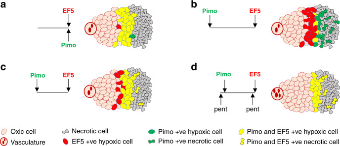 In each schematic the relative timing of administration of the drugs are indicated. a EF5 and Pimonidazole (Pimo) were co-administered and identified the hypoxic fraction, which was almost exclusively positive for both hypoxia markers. b In contrast, when the administration of the two markers was separated by 72 h there was little co-staining and an evident Pimo positive necrotic population. c The interval between administration of the hypoxia markers was reduced to 24 h, here co-stained hypoxic and necrotic cells were evident as well as an EF5 only population. d When the conditions shown in (c) were repeated with the inclusion of pentoxifylline (pent) to increase blood flow and reoxygenate transiently hypoxic cells prior to Pimo or EF5 injection, the remaining Pimo and EF5 labelled cells represented chronically hypoxic cells.