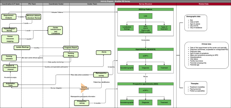 The Brazilian Policy of Comprehensive Care for People with Rare Diseases (BPCCPRD) was established by the Ministry of Health to reduce morbidity and mortality and improve the quality of life of people with rare diseases (RD). Several laboratory tests, most using molecular genetic technologies, have been incorporated by the Brazilian Public Health System, and 18 specialised centres have so far been established at university hospitals (UH) in the capitals of the Southern, Southeastern and Northeastern regions. However, whether the available human and technological resources in these services are appropriate and sufficient to achieve the goals of care established by the BPCCPRD is unknown. Despite great advances in diagnosis, especially due to new technologies and the recent structuring of clinical assessment of RD in Brazil, epidemiological data are lacking and when available, restricted to specific disorders. This position paper summarises the performance of a nationally representative survey on epidemiology, clinical status, and diagnostic and therapeutic resources employed for individuals with genetic and non-genetic RD in Brazil. The Brazilian Rare Disease Network (BRDN) is under development, comprising 40 institutions, including 18 UH, 17 Rare Diseases Reference Services and five Newborn Screening Reference Services. A retrospective study will be initially conducted, followed by a prospective study. The data collection instrument will use a standard protocol with sociodemographic data and clinical and diagnostic aspects according to international ontology. This great collaborative network is the first initiative of a large epidemiological data collection of RD in Latin America, and the results will increase the knowledge of RD in Brazil and help health managers to improve national public policy on RD in Brazil.