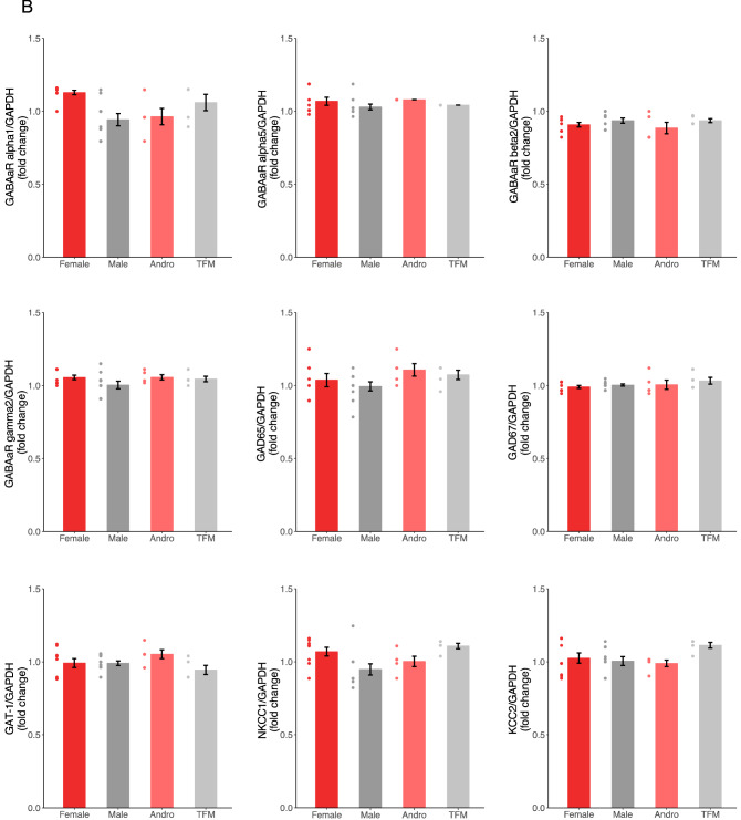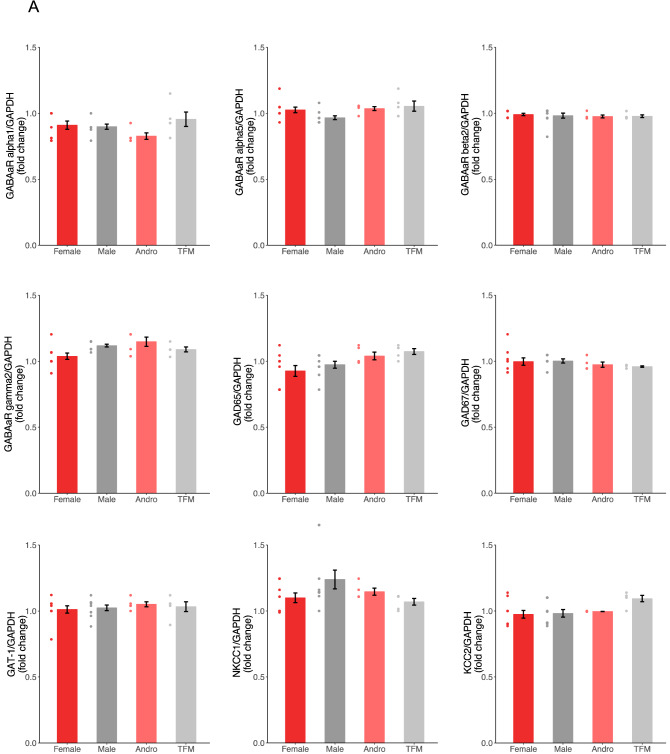 Sexual differentiation of the brain is influenced by testosterone and its metabolites during the perinatal period, when many aspects of brain development, including the maturation of GABAergic transmission, occur. Whether and how testosterone signaling during the perinatal period affects GABAergic transmission is unclear. Here, we analyzed GABAergic circuit functional markers in male, female, testosterone-treated female, and testosterone-insensitive male rats after the first postnatal week and in young adults. In the hippocampus, mRNA levels of proteins associated with GABA signaling were not significantly affected at postnatal day (P) 7 or P40. Conversely, membrane protein levels of KCC2, which are critical for determining inhibition strength, were significantly higher in females compared to males and testosterone-treated females at P7. Further, female and testosterone-insensitive male rats at P7 showed higher levels of the neurotrophin BDNF, which is a powerful regulator of neuronal function, including GABAergic transmission. Finally, spontaneous GABAergic currents in hippocampal CA1 pyramidal cells were more frequent in females and testosterone-insensitive males at P40. Overall, these results show that perinatal testosterone levels modulate GABAergic circuit function, suggesting a critical role of perinatal sex hormones in regulating network excitability in the adult hippocampus.