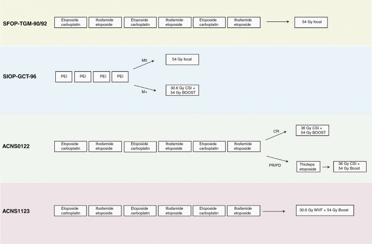 Methods: European and North American clinical trials for patients with CNS-NGGCT (SIOP-GCT-96, SFOP-TGM-TC 90/92, COG-ACNS0122, and COG-ACNS1123) were pooled for analysis. Additionally, patients included and treated in the UK and France national registries under strict protocol guidelines were included as an independent, non-overlapping cohort.