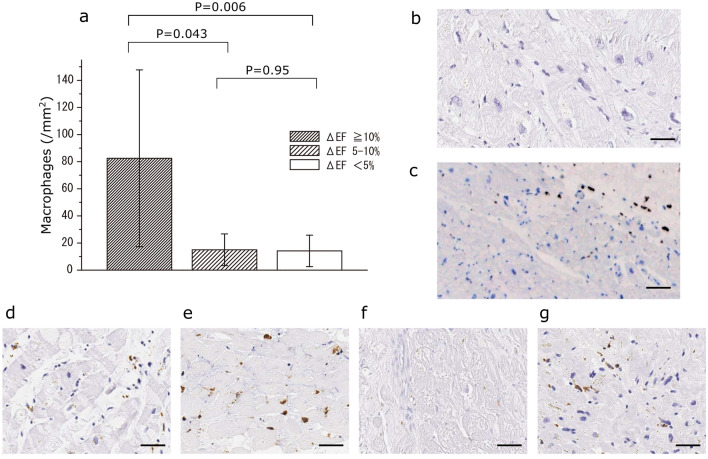Methods: We reviewed 50 consecutive dilated cardiomyopathy patients implanted with HeartMate II at our institute between April 2013 and December 2018 who were treated with optimal medical therapy during left ventricular assist device support. Patients were stratified by improvement of the left ventricular ejection fraction at 6 months after implantation: ≥ 10% increase (Gr ≥ 10%), 5-10% (Gr 5-10%), and ≤ 5% (Gr ≤ 5%). T cells and macrophages were evaluated in the apical myocardium after left ventricular assist device implantation.