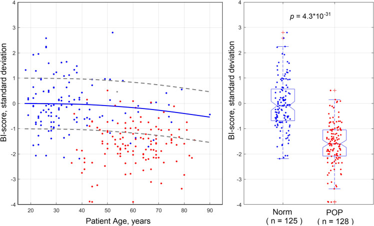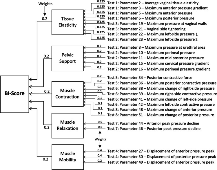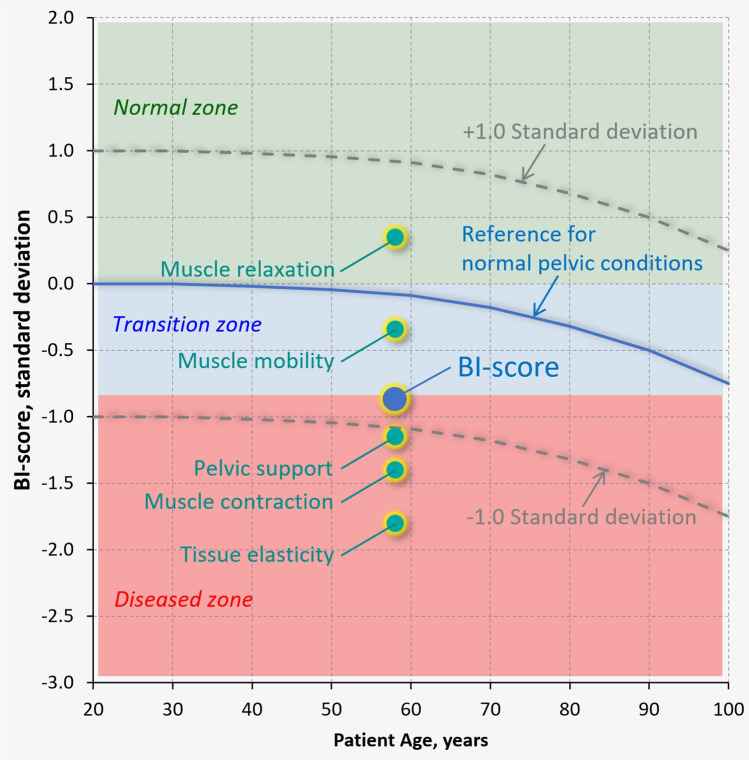 Results: Twenty-six parameters were identified as statistically sensitive to POP development. They were subdivided into five groups to characterize (1) tissue elasticity, (2) pelvic support, (3) pelvic muscle contraction, (4) involuntary muscle relaxation, and (5) pelvic muscle mobility. Every parameter was transformed to its standard deviation units against the patient age similar to T-score for bone density. Linear combinations with specified weights led to the composition of five component parameters for groups (1)-(5) and the BI-score in standard deviation units. The p-value for the BI-score has p = 4.3 × 10-31 for POP versus normal conditions. A reference BI-score curve against age for normal pelvic floor conditions was defined.
