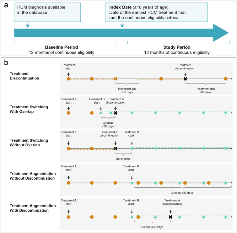 Methods: Adults with symptomatic obstructive HCM as per study design and treated with pharmacotherapies [beta blockers (BBs), calcium channel blockers (CCBs), BB + CCB, or disopyramide] or procedures (septal reduction therapy, heart transplantation, implantable cardioverter-defibrillator, and pacemaker implantation) were identified from the IBM® MarketScan® Commercial and Medicare Supplemental database (January 2009-March 2019). Patients had 12-month continuous eligibility before and after (study period) treatment initiation (index treatment). Healthcare resource utilization (HRU), costs, and treatment changes were assessed.
