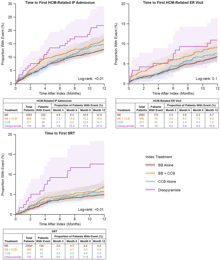 Results: Of the 4883 patients included in the analysis, 85% received pharmacotherapies (BB 52.5%; CCB 11.7%; BB + CCB 17.7%; disopyramide 2.4%) and 15.7% underwent procedures. During the study period, 38, 34, and 100% of all patients had ≥ 1 inpatient stay, emergency room (ER) visit, and outpatient visit, respectively; mean total healthcare costs were US$53,053. Patients undergoing procedures had the highest HRU and costs across groups. Among patients receiving pharmacotherapies, HRU was lowest with BBs and highest with disopyramide. Treatment changes were observed in 43.8% of patients receiving pharmacotherapies.