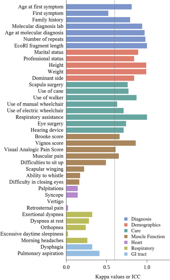 Results: Patients and physicians agreed on a majority of questions common to the SRQ and CEF (24 out of 39). Demographic, diagnosis- and care-related questions were generally answered consistently by the patient and the medical practitioner (kappa or ICC values of most items in these groups were greater than 0.8). Muscle function-related items, i.e. FSHD-specific signs, showed an overall medium to poor correlation between data provided in the two forms; the distribution of agreements in this section was markedly spread out and ranged from poor to good. In particular, there was very little agreement regarding the assessment of facial motricity and the presence of a winged scapula. However, patients and physicians agreed very well on the Vignos and Brooke scores. The report of symptoms not specific to FSHD showed general poor consistency.