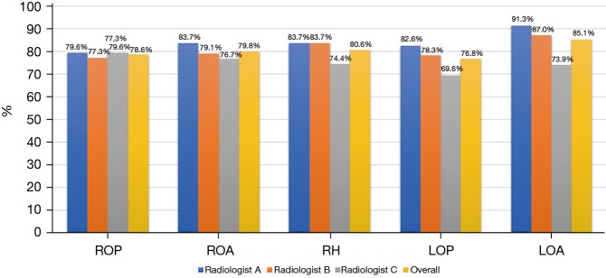 Results: There were included 67 patients, being 37 (55%) males, with a mean age of 64 years. The accuracy of radiological identification of complete fissures ranged from 76.8% for left posterior oblique fissure to 85.1% for left anterior oblique fissure, with the best performance achieved by the most experienced radiologist. The concordance of the radiological evaluation for fissure integrity compared to the surgical assessment (k) was 0.53-0.68. Intra-observer agreement ranged from 0.74 to 0.87.