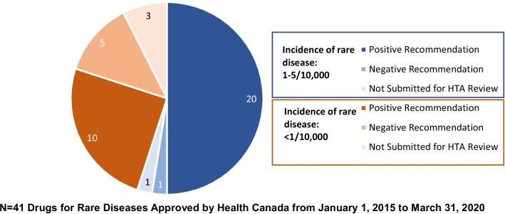 Methods: Given its similarity to the Canadian health care system, we used Europe as the reference point to analyze all of the therapies with an orphan drug designation approved by the European Medicine Agency (EMA) from 1 January 2015 to 31 March 2020. We then contrasted access to these drugs in Canada (Health Canada) and the U.S. (Food and Drug Administration, FDA). We focused on: (1) the number of therapies for rare diseases entering the Canadian market; (2) the percentage of these therapies that are publicly available to Canadians; and (3) the timelines for patients to access these therapies in Canada.