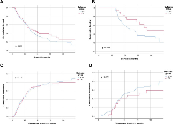 Results: Of 283 patients, TO was achieved in 67 (24%) patients. Multivariate analysis revealed that preoperative biliary drainage was associated with a decreased (OR= 0.405, 95% CI: 0.194-0.845, p=0.016) and left-sided-resection (OR= 1.899, 95% CI: 1.048-3.440, p=0.035) with increased odds for TO. Overall survival (OS) and DFS (disease-free survival) did not differ significantly between the outcome groups (OS: p=0.280, DFS: p=0.735). However, there was a trend towards better overall survival, especially in the late course with TO.