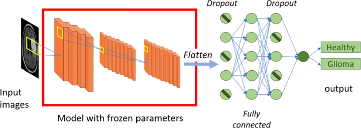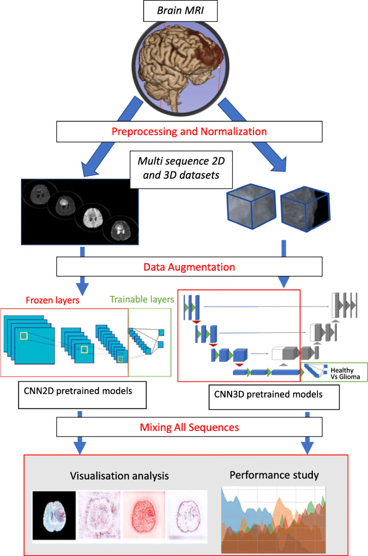 Glioma is one of the most important central nervous system tumors, ranked 15th in the most common cancer for men and women. Magnetic Resonance Imaging (MRI) represents a common tool for medical experts to the diagnosis of glioma. A set of multi-sequences from an MRI is selected according to the severity of the pathology. Our proposed approach aims moreto create a computer-aided system that is capable of helping morethe expert diagnose the brain gliomas. moreWe propose a supervised learning regime based on a convolutional neural network based framework and transfer learning techniques. Our research morefocuses on the performance of different pre-trained deep learning models with respect to different MRI sequences. We highlight the best combinations of such model-MRI sequence couple for our specific task of classifying healthy brain against brain with glioma. moreWe also propose to visually analyze the extracted deep features for studying the existing relation of the MRI sequences and models. This interpretability analysis gives some hints for medical expert to understand the diagnosis made by the models. Our study is based on the well-known BraTS datasets including multi-sequence images and expert diagnosis.