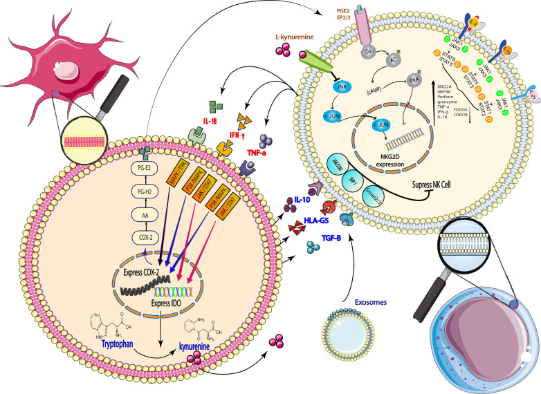 Natural killer cells (NK cells) are innate immune cells that are activated to fight tumor cells and virus-infected cells. NK cells also play an important role in the graft versus leukemia response. However, they can over-develop inflammatory reactions by secreting inflammatory cytokines and increasing Th1 differentiation, eventually leading to tissue damage. Today, researchers have attributed some autoimmune diseases and GVHD to NK cells. On the other hand, it has been shown that mesenchymal stem cells (MSCs) can modulate the activity of NK cells, while some researchers have shown that NK cells can cause MSCs to lysis. Therefore, we considered it is necessary to investigate the effect of these two cells and their signaling pathway in contact with each other, also their clinical applications.
