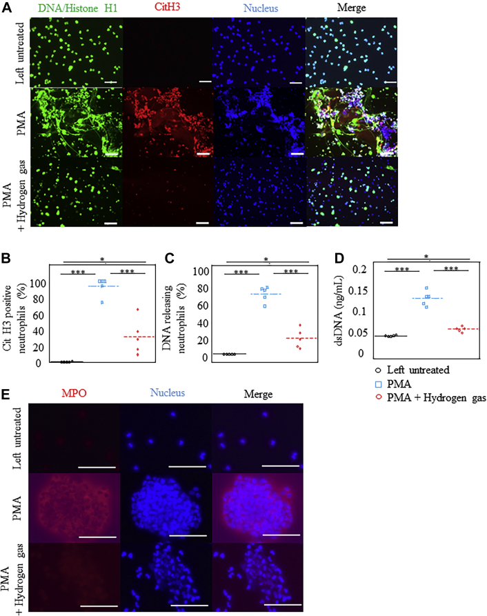 Neutrophil extracellular traps (NETs) contribute to inflammatory pathogenesis in numerous conditions, including infectious and cardiovascular diseases, and have attracted attention as potential therapeutic targets. H2 acts as an antioxidant and has been clinically and experimentally proven to ameliorate inflammation. This study was performed to investigate whether H2 could inhibit NET formation and excessive neutrophil activation. Neutrophils isolated from the blood of healthy volunteers were stimulated with phorbol-12-myristate-13-acetate (PMA) or the calcium ionophore A23187 in H2-exposed or control media. Compared with control neutrophils, PMA- or A23187-stimulated human neutrophils exposed to H2 exhibited reduced neutrophil aggregation, citrullination of histones, membrane disruption by chromatin complexes, and release of NET components. CXCR4high neutrophils are highly prone to NETs, and H2 suppressed Ser-139 phosphorylation in H2AX, a marker of DNA damage, thereby suppressing the induction of CXCR4 expression. H2 suppressed both myeloperoxidase chlorination activity and production of reactive oxygen species to the same degree as N-acetylcysteine and ascorbic acid, while showing a more potent ability to inhibit NET formation than these antioxidants do in PMA-stimulated neutrophils. Although A23187 formed NETs in a reactive oxygen species-independent manner, H2 inhibited A23187-induced NET formation, probably via direct inhibition of peptidyl arginine deiminase 4-mediated histone citrullination. Inhalation of H2 inhibited the formation and release of NET components in the blood and bronchoalveolar lavage fluid in animal models of lipopolysaccharide-induced sepsis (mice and aged mini pigs). Thus, H2 therapy can be a novel therapeutic strategy for NETs associated with excessive neutrophil activation.