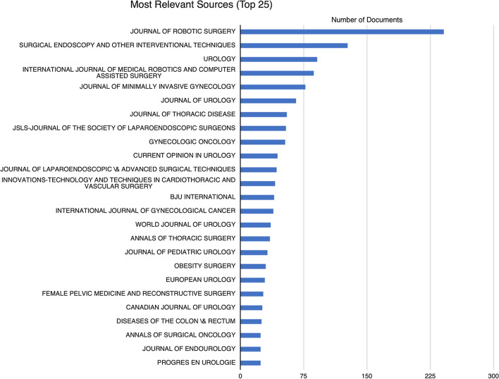 Results: The search yielded 3839 documents, from 879 different sources. Only 2% of sources were found to be within Bradford's Zone 1 of research and the most relevant sources were from the field of urology. The Journal of Urology and Surgical Endoscopy and other Techniques ranked highly among metrics such as H, G, M index and total citations. The top-rated authors had a H index of 15 in the field of robotic surgery and the total citations reached a peak at 1342. The USA, Japan and Italy were the most productive nations and increased collaborative research is leading to a greater number of multiple-centre publications.
