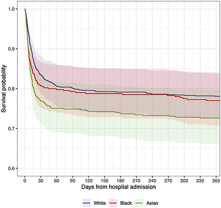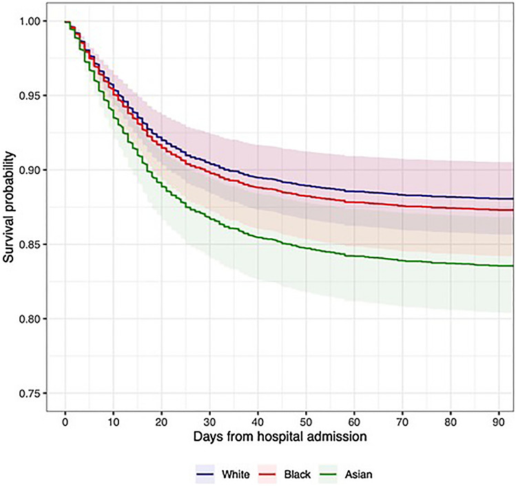 It is unclear if changes in public behaviours, developments in COVID-19 treatments, improved patient care, and directed policy initiatives have altered outcomes for minority ethnic groups in the second pandemic wave. This was a prospective analysis of patients aged ≥ 16 years having an emergency admission with SARS-CoV-2 infection between 01/09/2020 and 17/02/2021 to acute NHS hospitals in east London. Multivariable survival analysis was used to assess associations between ethnicity and mortality accounting for predefined risk factors. Age-standardised rates of hospital admission relative to the local population were compared between ethnic groups. Of 5533 patients, the ethnic distribution was White (n = 1805, 32.6%), Asian/Asian British (n = 1983, 35.8%), Black/Black British (n = 634, 11.4%), Mixed/Other (n = 433, 7.8%), and unknown (n = 678, 12.2%). Excluding 678 patients with missing data, 4855 were included in multivariable analysis. Relative to the White population, Asian and Black populations experienced 4.1 times (3.77-4.39) and 2.1 times (1.88-2.33) higher rates of age-standardised hospital admission. After adjustment for various patient risk factors including age, sex, and socioeconomic deprivation, Asian patients were at significantly higher risk of death within 30 days (HR 1.47 [1.24-1.73]). No association with increased risk of death in hospitalised patients was observed for Black or Mixed/Other ethnicity. Asian and Black ethnic groups continue to experience poor outcomes following COVID-19. Despite higher-than-expected rates of hospital admission, Black and Asian patients also experienced similar or greater risk of death in hospital since the start of the pandemic, implying a higher overall risk of COVID-19 associated death in these communities.