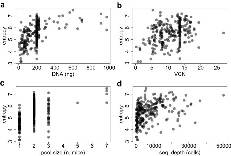 Viral vectors are used to insert genetic material into semirandom genomic positions of hematopoietic stem cells which, after reinfusion into patients, regenerate the entire hematopoietic system. Hematopoietic cells originating from genetically modified stem cells will harbor insertions in specific genomic positions called integration sites, which represent unique genetic marks of clonal identity. Therefore, the analysis of vector integration sites present in the genomic DNA of circulating cells allows to determine the number of clones in the blood ecosystem. Shannon diversity index is adopted to evaluate the heterogeneity of the transduced population of gene corrected cells. However, this measure can be affected by several technical variables such as the DNA amount used and the sequencing depth of the library analyzed and therefore the comparison across samples may be affected by these confounding factors. We developed an advanced spline-regression approach that leverages on confounding effects to provide a normalized entropy index. Our proposed method was first validated and compared with two state of the art approaches in a specifically designed in vitro assay. Subsequently our approach allowed to observe the expected impact of vector genotoxicity on entropy level decay in an in vivo model of hematopoietic stem cell gene therapy based on tumor prone mice.