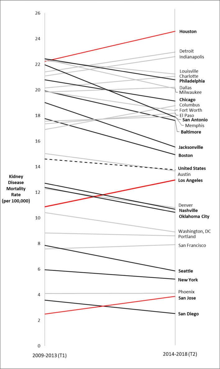 Methods: We used National Vital Statistics System mortality data and American Community Survey population estimates to calculate age-standardized kidney disease mortality rates for the non-Hispanic Black (Black), non-Hispanic White (White), and total populations for the USA and the 30 most populous US cities. We examined two time points, 2008-2013 (T1) and 2014-2018 (T2), and assessed changes in rates and inequities over time. Racial inequities were measured with Black:White mortality rate ratios and rate differences.