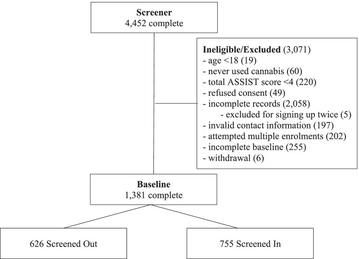 Results: Nearly half of those initially eligible for the RCT were subsequently screened out for data quality issues (n = 626, 45.3%). Between-group bivariate analysis found that those screened out (OUT) were significantly older (OUT = 39.5 years (SD = 13.9), IN = 35.7 years (SD = 12.9), p < .001), more had annual incomes less than $20,000CND (OUT = 58.3%, IN = 53.0%, p = .047), used cannabis less often in the past 30 days (OUT = 23.3 days (SD = 9.7), IN = 24.8 days (SD = 11.3), p < .006), and had lower total ASSIST scores at screener (OUT = 19.3 (SD = 8.0), IN = 23.8 (SD = 10.4), p < .001) and baseline (OUT = 17.5 (SD = 7.9), IN = 23.3 (SD = 10.3), p < .001) compared to participants who were screened in to the RCT.