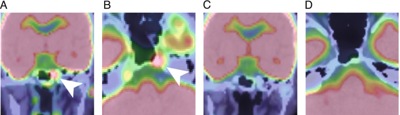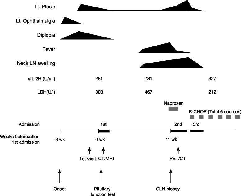 Case presentation: A 71-year-old woman visited our hospital with left ophthalmalgia, ptosis, and diplopia. Neurological findings revealed left oculomotor, trochlear and abducent nerve palsies. Endocrine tests indicated partial hypopituitarism. Initial CT and MRI revealed that a mass in sphenoidal and cavernous sinuses had invaded the sella with osteolysis of the sphenoid bone. At around four weeks, almost all the symptoms of cranial nerve palsies were relieved. Seven weeks later, she had a high fever and cervical lymph node (CLN) swellings. CLN biopsy revealed CD20-positive B-cells. She was diagnosed with diffuse large B-cell lymphoma (DLBCL). 18F-fluorodeoxyglucose positron emission tomography/computed tomography (PET/CT) revealed elevated uptake at the erosion lesion of the sphenoidal bone, but not the pituitary gland. After chemotherapy, all the symptoms related to systemic lymphoma were relieved, but partial hypopituitarism remained. The mass in sphenoidal and cavernous sinuses and elevated uptake by PET/CT were dissolved.