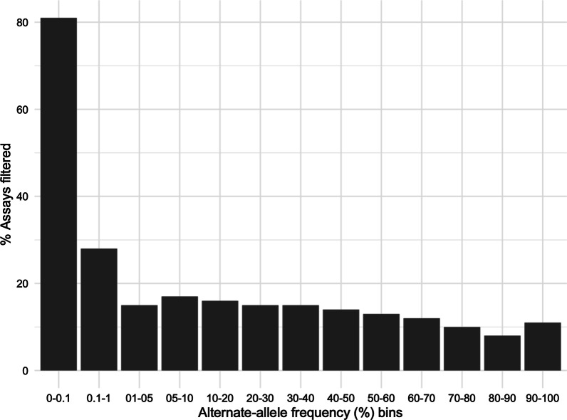 Results: Quality analyses detected sample contamination and increased assay failure along the chip margins. Comparison to benchmark data demonstrated that > 82% of the GSA assays had a PPV of 1. GSA assays targeting transitions, genomic regions of high complexity, and common variants performed better than those targeting transversions, regions of low complexity, and rare variants. Comparison of GSA data to rWGS and 1KG data showed > 99% performance across all measured parameters. Consistent with predictions from prior studies, the GSA detection of variation within the MAP59 genes was 3/261.