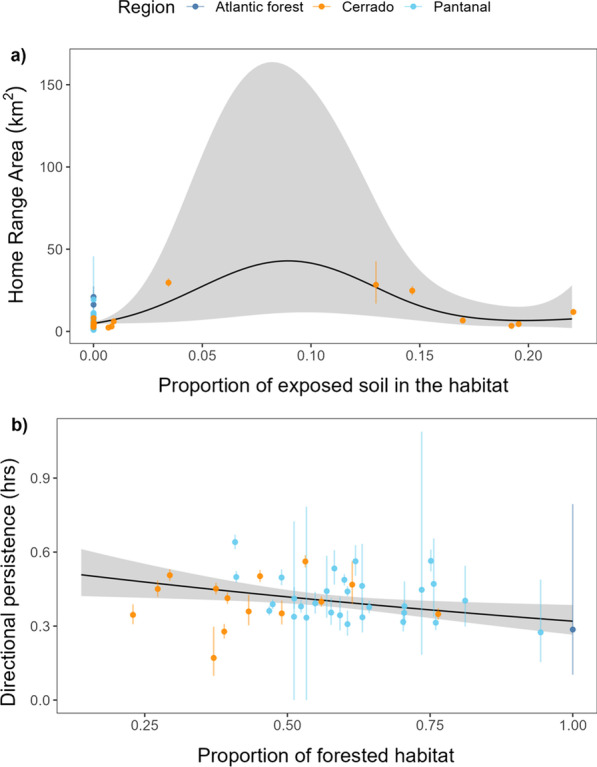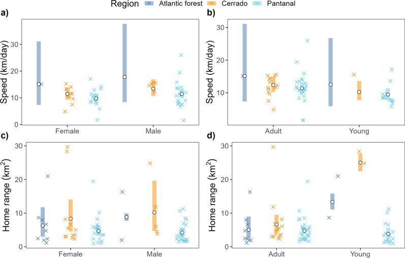 Results: From these data we found that the mean home range size across all monitored tapirs was 8.31 km2 (95% CI 6.53-10.42), with no evidence that home range sizes differed between sexes nor age groups. Interestingly, although the Atlantic Forest, Cerrado, and Pantanal vary substantially in habitat composition, levels of human disturbance, and tapir population densities, we found that lowland tapir movement behaviour and space use were consistent across all three biomes. Human disturbance also had no detectable effect on lowland tapir movement. Lowland tapirs living in the most altered habitats we monitored exhibited movement behaviour that was comparable to that of tapirs living in a near pristine environment.