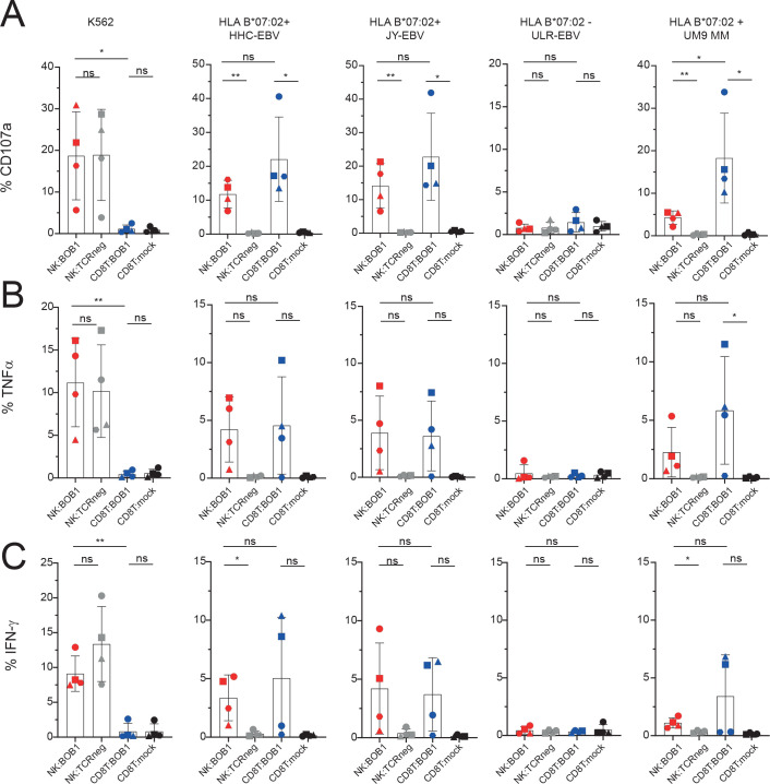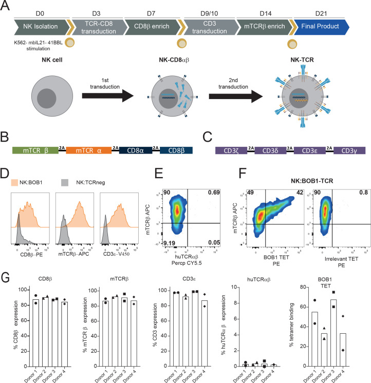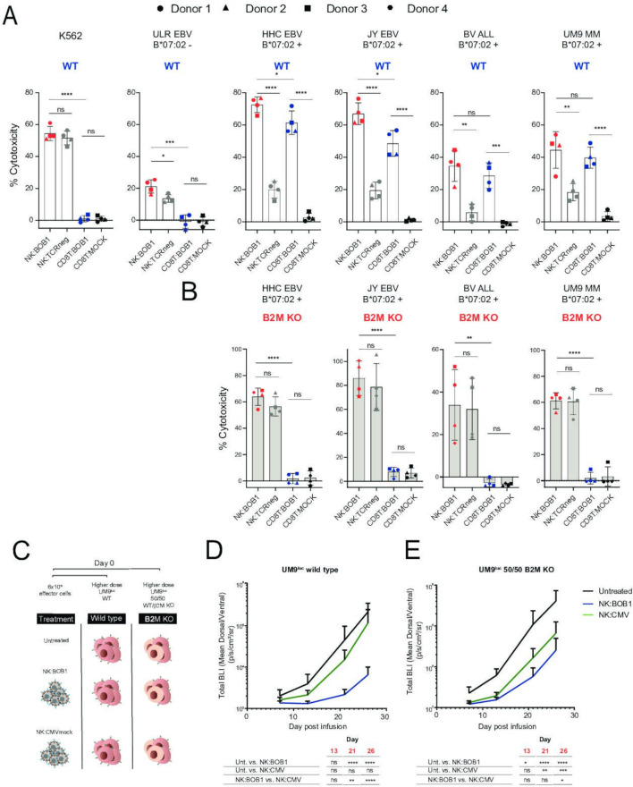 Methods: BOB1, is a transcription factor highly expressed in all healthy and malignant B cell lineages, including multiple myeloma (MM). Expression of an HLA-B*07:02 restricted BOB1-specifc TCR in peripheral blood-derived NK cells was achieved following a two-step retroviral transduction protocol. NK-TCR was then compared with TCR-negative NK cells and CD8-T cells expressing the same TCR for effector function against HLA-B*07:02+ B-cell derived lymphoblastoid cell lines (B-LCL), B-cell acute lymphoblastic leukemia and MM cell lines in vitro and in vivo.