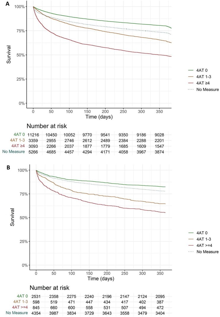 Results: 4AT completion rates were 77% in Lothian and 49% in Salford. 4AT scores indicating delirium (≥4/12) were present in 18% of patients in Lothian, and 25% of patients in Salford. Thirty-day mortality with 4AT ≥4 was 5.5-fold greater than the 4AT 0/12 group in Lothian (adjusted odds ratio (aOR) 5.53, 95% confidence interval [CI] 4.99-6.13) and 3.4-fold greater in Salford (aOR 3.39, 95% CI 2.98-3.87). Length of stay was more than double in patients with 4AT scores of 1-3/12 (indicating cognitive impairment) or ≥ 4/12 compared with 4AT 0/12. Median home time at 1 year was reduced by 112 days (Lothian) and 61 days (Salford) in the 4AT ≥4 group (P < 0.001).