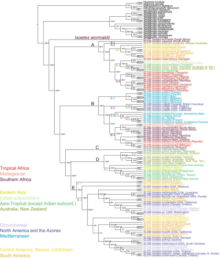 Results: Our results reveal an unexpected discovery of an "Amborella syndrome" in Isoetaceae: a single poorly known species is sister to the remaining family. The species, Isoetes wormaldii, is a rare endemic to the Eastern Cape of South Africa. Its leaves are flattened with a rounded point, which sharply contrasts with the awl-shaped leaves of most other species of Isoetes. The remaining species of Isoetes are resolved in five major clades, also indicated in previous work. While the phylogeny shows geographic structure, the patterns are complex. For example, tropical-southern African species occur in at least five clades, and Indian, Australian and Mediterranean species in at least three clades each.