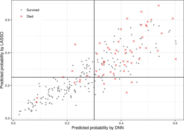 Results: Performances for models a, b and c were comparable with an area under the receiver operating curve of 0.73 (95% confidence interval [CI] 0.65-0.79), 0.76 (95% CI 0.68-0.82) and 0.77 (95% CI 0.70-0.83) respectively. Predictors of mortality in the LASSO model were age, low QRS voltage, ST depression, premature atrial complexes, sex, increased ventricular rate, and right bundle branch block.