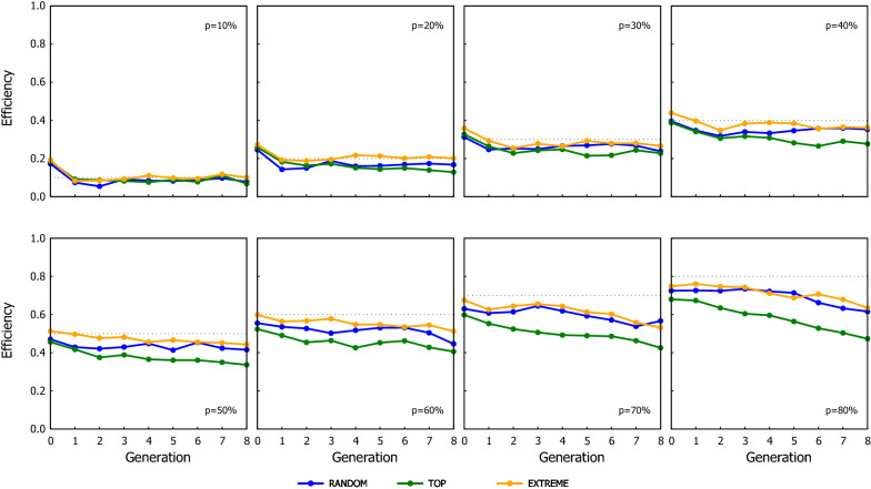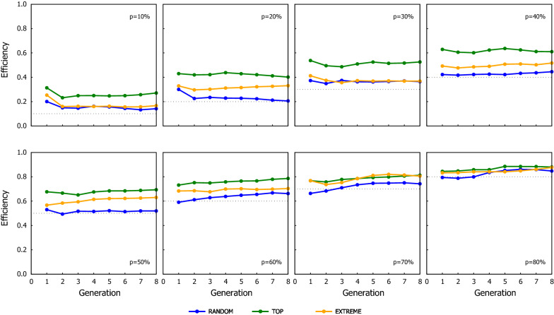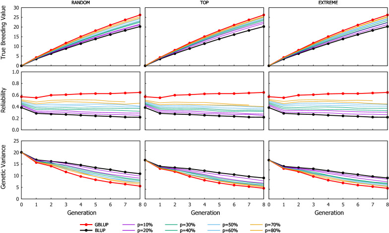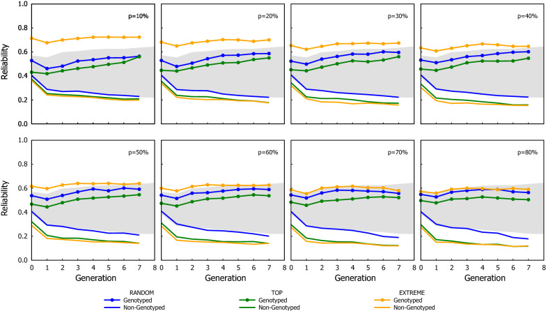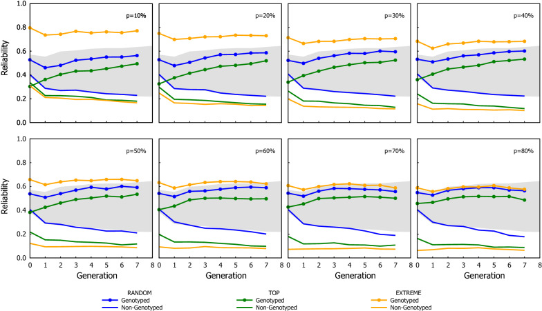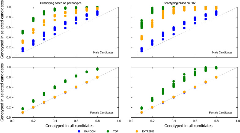 Results: The genotyping strategy with the greatest cumulated gain was TOP followed by RANDOM, with EXTREME behaving as RANDOM at low p and as TOP with high p. However, the reliability of GEBV was higher with RANDOM than with TOP. This disparity between the trend of the gain and the reliability is due to the TOP scheme genotyping the candidates with the greater chances of being selected. The extra gain obtained with TOP increases when the accuracy of the selection criterion to rank candidates to be genotyped increases.
