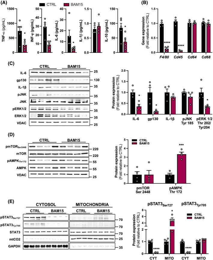 Methods: Eighty-week-old male C57BL/6J mice with obesity were randomized to 10 weeks of high fat diet (CTRL) or BAM15 (BAM15; 0.1% w/w in high fat diet) treatment. Body weight and food intake were measured weekly. Body composition, muscle function, energy expenditure, locomotor activity, and glucose tolerance were determined after treatment. Skeletal muscle was harvested and evaluated for histology, gene expression, protein signalling, and mitochondrial structure and function.