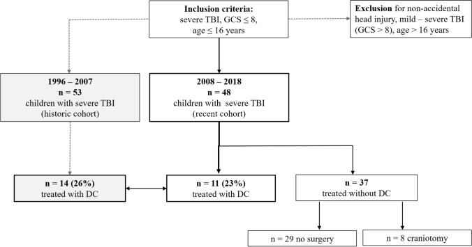 Purpose: Traumatic brain injury (TBI) is one of the leading causes of death and disability in children. Medical therapy remains limited, and decompressive craniectomy (DC) is an established rescue therapy in case of elevated intracranial pressure (ICP). Much discussion deals with clinical outcome after severe TBI treated with DC, while data on the pediatric population is rare. We report our experience of treating severe TBI in two different treatment setups at the same academic institution.