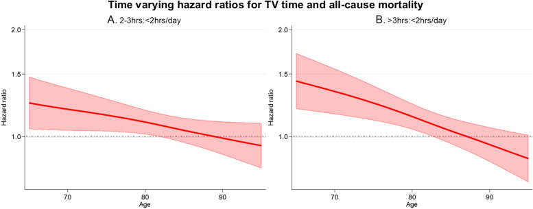 Results: From 19,570 participants, 4,417 deaths were reported over a median follow up of 14.5 years. More TV time was associated with earlier mortality; however, this relationship diminished with increasing age. The hazard ratio (HR) and 95% confidence interval (95% CI) for > 3 h/day compared with < 2 h/day of TV time was 1.34 (1.16, 1.55) at 70 years, 1.14 (1.04, 1.23) at 80 years, and 0.95 (0.84, 1.06) at 90 years. The TV time/mortality relationship was more evident in participants who were physically inactive (compared with active; p for interaction < 0.01) or had a higher dietary inflammatory index score (compared with a lower score; p for interaction = 0.03). No interactions were detected between TV time and BMI, smoking, alcohol intake, nor soft-drink consumption (all p for interaction > 0.16).