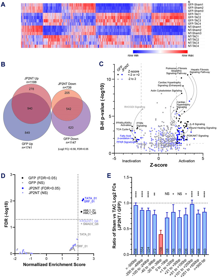 A, Heatmap of significant differentially expressed genes (DEGs, 1.5-fold change, FDR (padj) < 0.05,) for all comparison groups as determined by RNA-seq analysis. Surgery was performed in 9–10-week-old male mice and injected with AAV-eGFP or AAV-JP2NT (NT) viruses via tail vein two weeks later and harvested 6 weeks after surgery. B, Venn diagram of upregulated and downregulated DEGs after TAC versus sham surgery in AAV-eGFP and AAV-JP2NT infected ventricles. C, Ingenuity Pathway Analysis results for enriched predicted canonical pathways. A threshold of ±2 Z-score and Benjamini-Hochberg (B-H) multiple test-corrected p<0.05 (dashed lines) was used for determining activation. Arrows indicate viral-dependent changes in the coordinates of example pathways known to be altered during cardiac function or are fibrosis related in other tissues. D, Gene set enrichment analysis (GSEA) for transcription factor binding motifs within the promoters of DEGs. E, TAC-regulated DEGs with canonical proximal promoter TATA box motifs are sensitive to repression by JP2NT. The ratio of log2 fold changes for DEGs (FDR < 0.05) in JP2NT (Sham vs. TAC) versus GFP (Sham vs. TAC) treated groups. Distances of closest TATA box motifs from DEG TSSs were binned as shown. All bins were compared with that of TATA boxes located 20-39 bp upstream of the TSS (red bar, one-way ANOVA). Number of DEGs in each bin is indicated within the bars. FDR, false discovery rate; NS, not significant; *, p<0.5; **, p<0.01; ***, p<0.001; ****, p<0.0001.